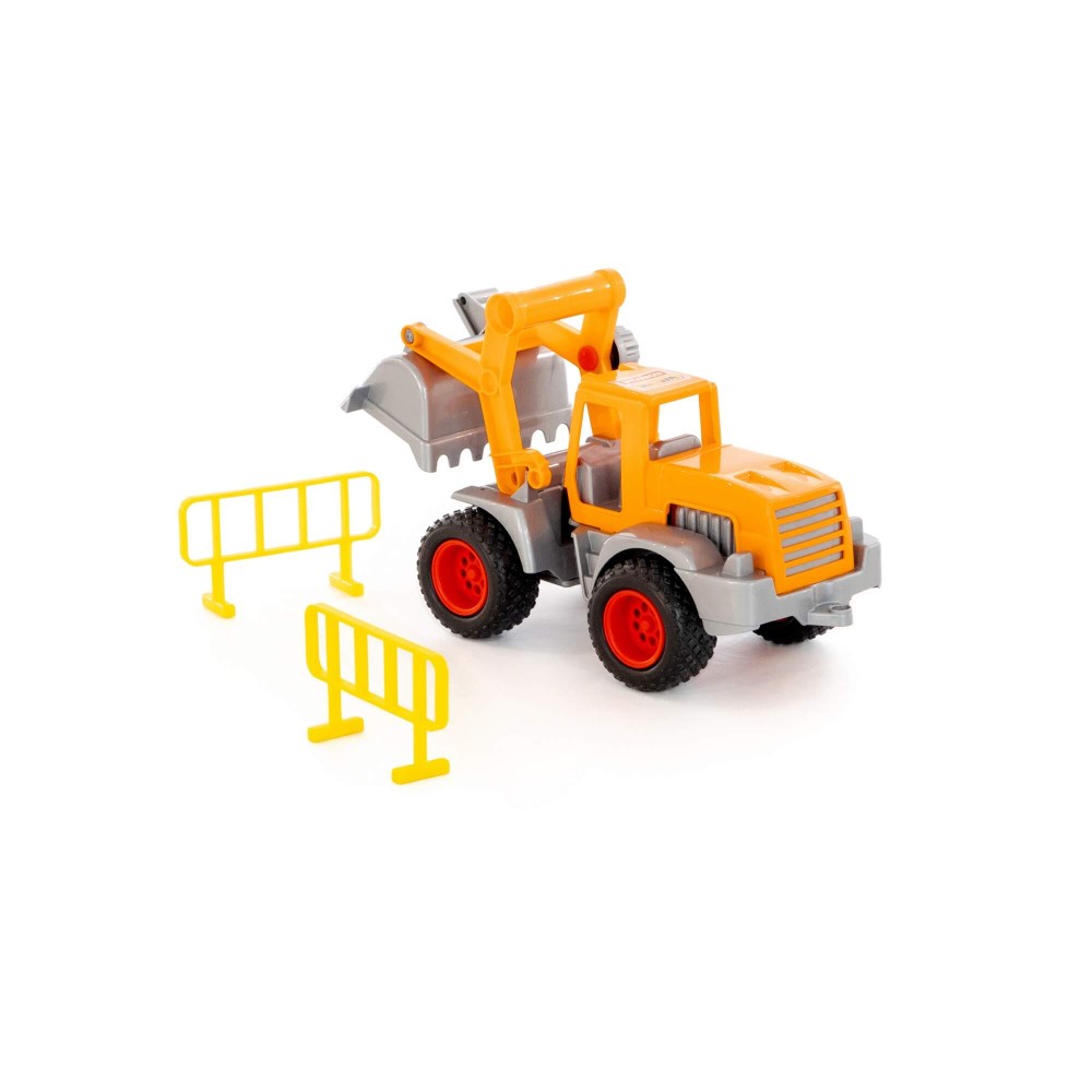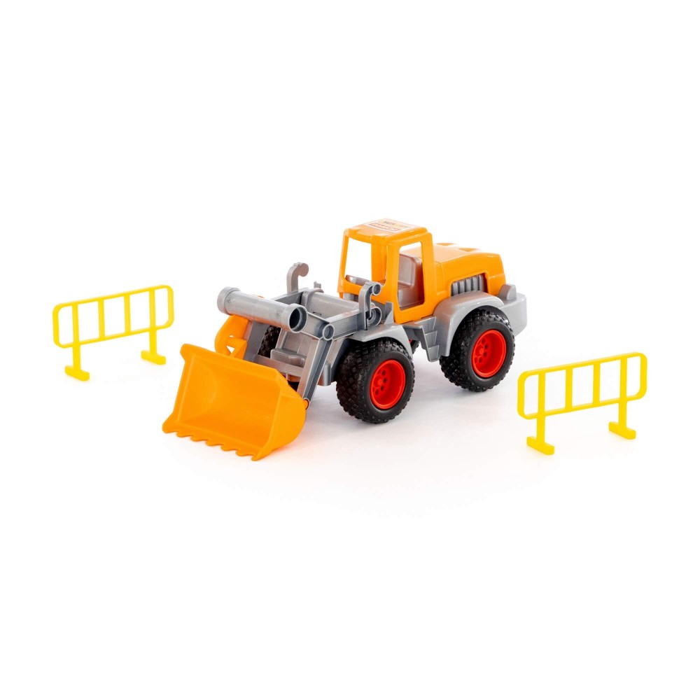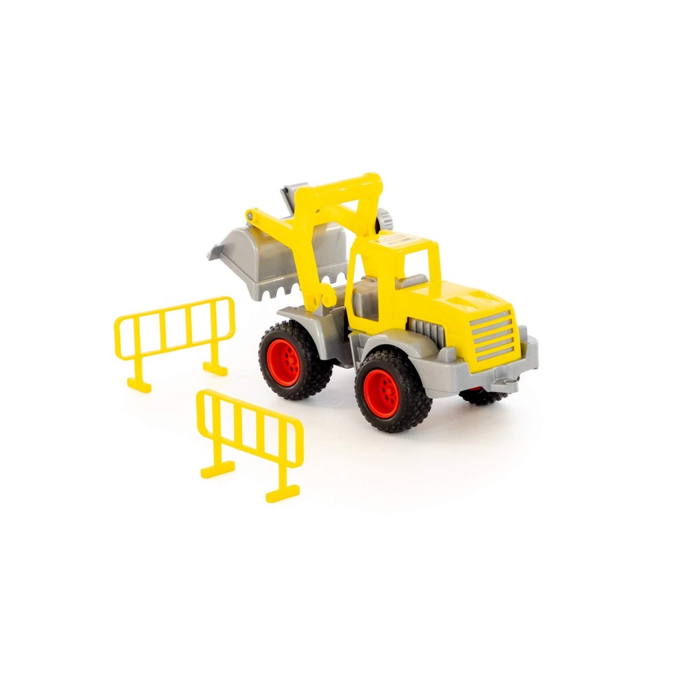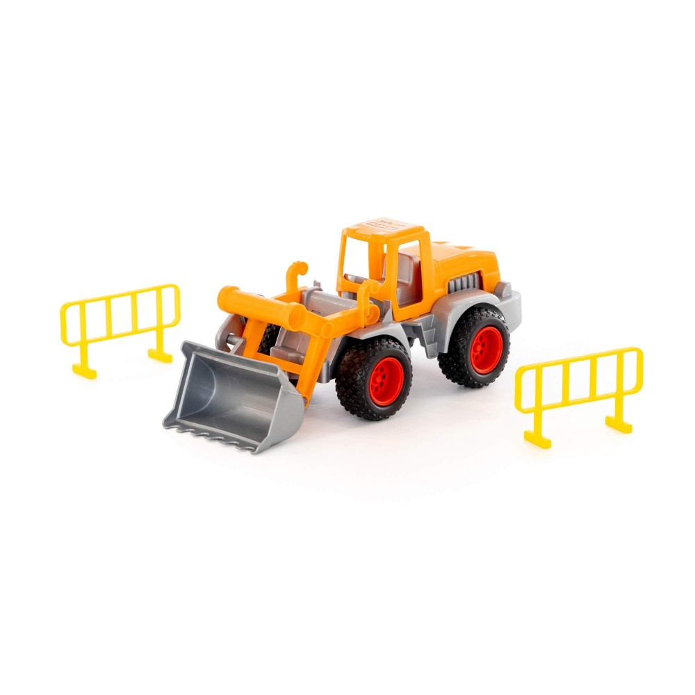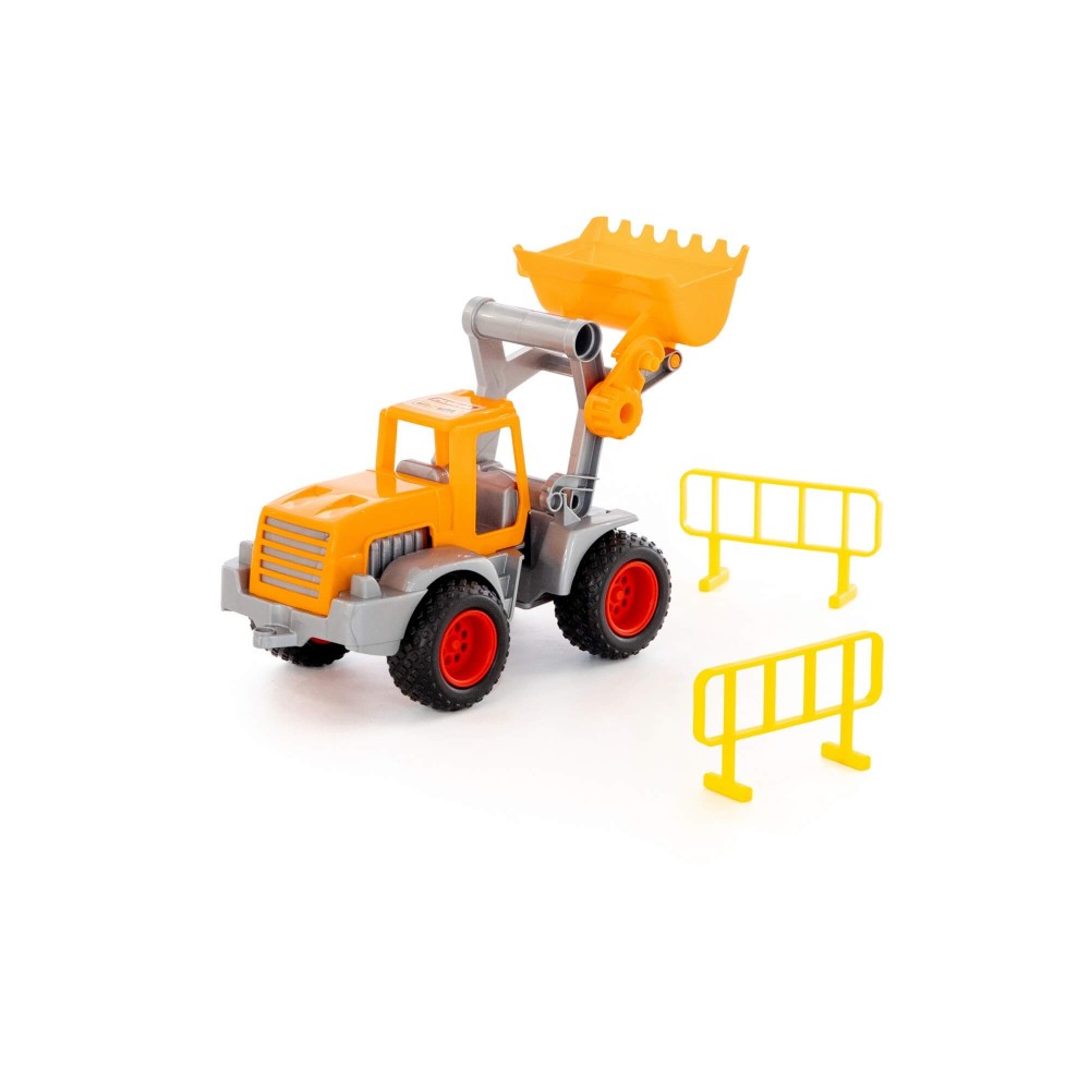 Игрушка выполнена в запоминающейся цветовой гамме из высококачественных материалов. Машинка оборудована резиновыми шинами с крупным протектором, что обеспечивает высокую проходимость и бесшумное движение по различным видам поверхностей, ей интересно играть как дома, так на свежем воздухе. Трактор-погрузчик оборудован подвижным ковшом для совершения манипуляций с различными грузами. В комплект к строительной технике входят специальные ограждения.