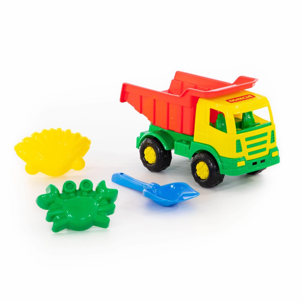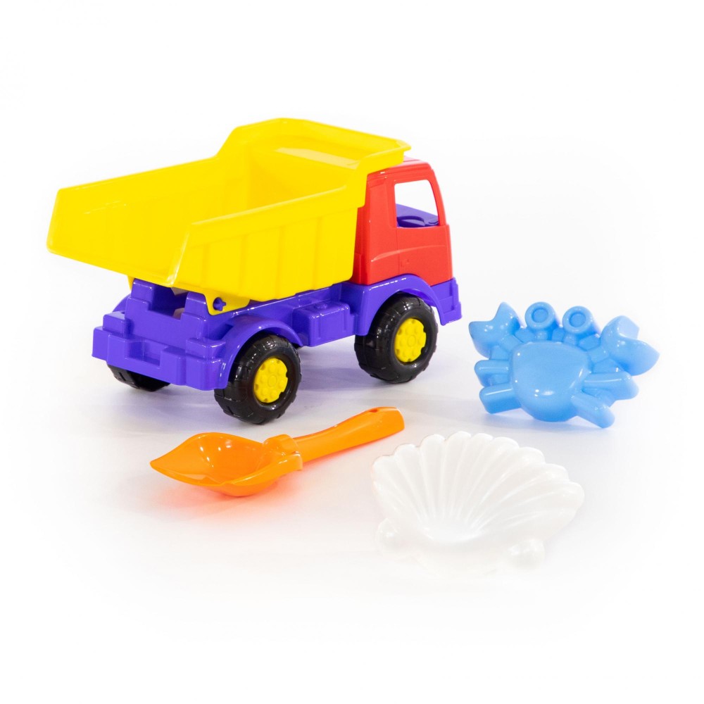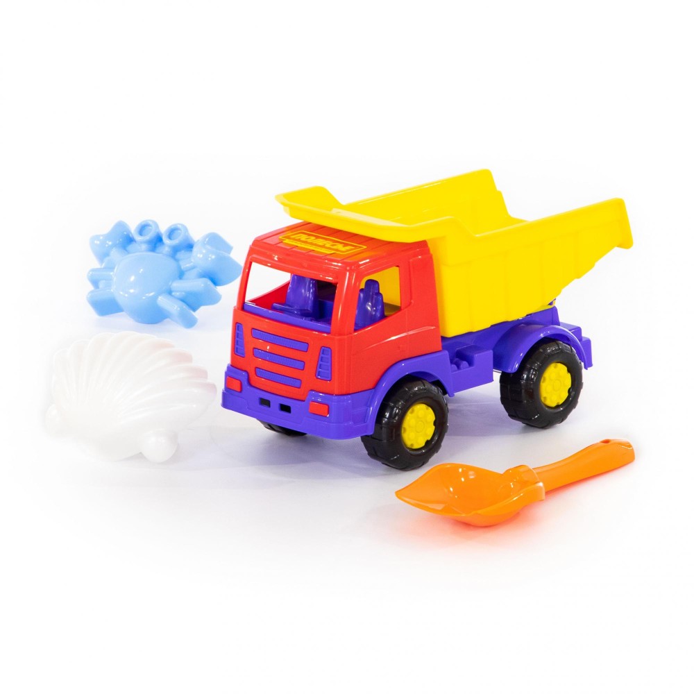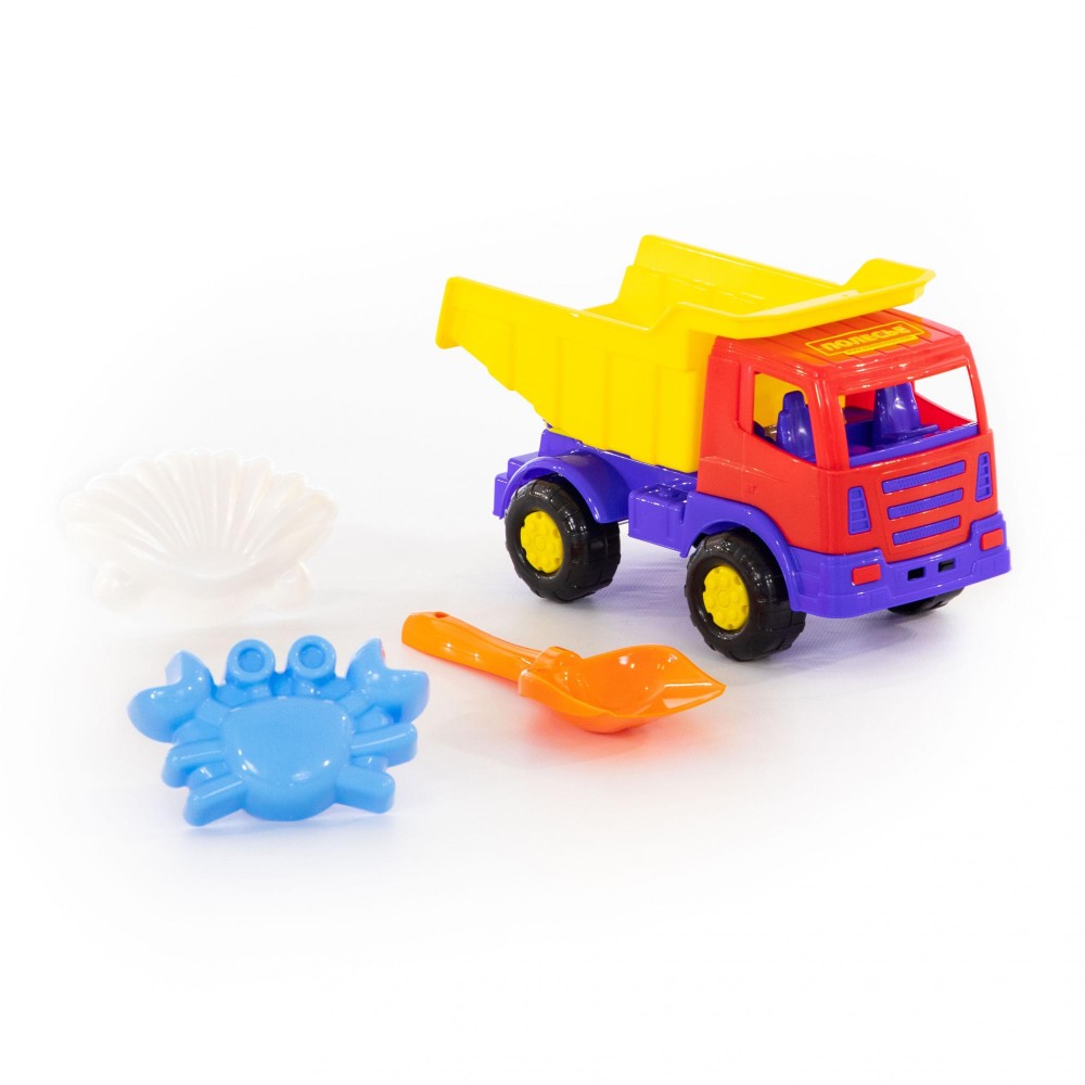 Автомобиль-самосвал "Мираж" имеет оптимальный размер для игры как дома, так и на улице. В кузове карьерного типа удобно возить, насыпать и ссыпать песок. В комплекте с автомобилем идут: лопатка №5, формочки (краб №1 + ракушка №1).