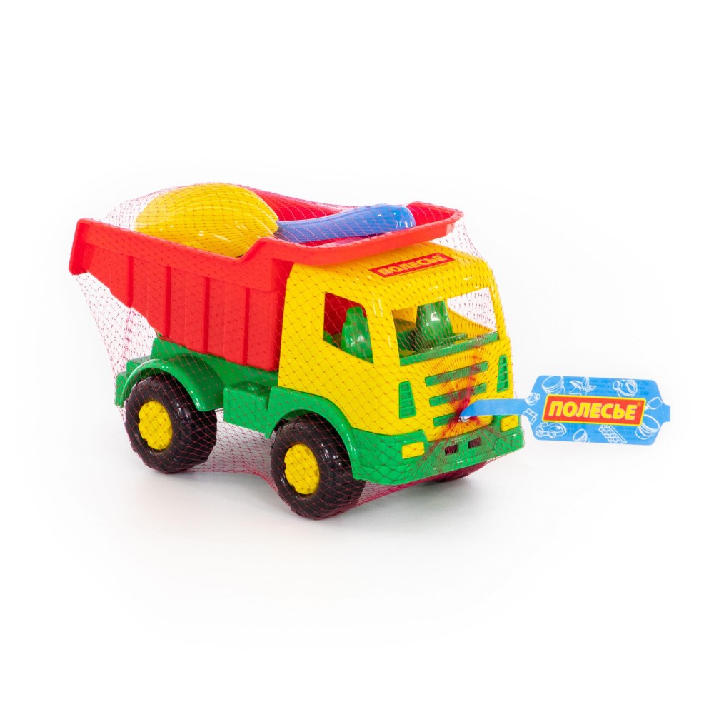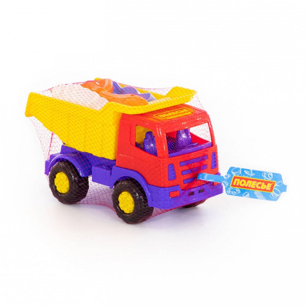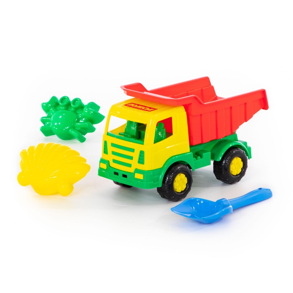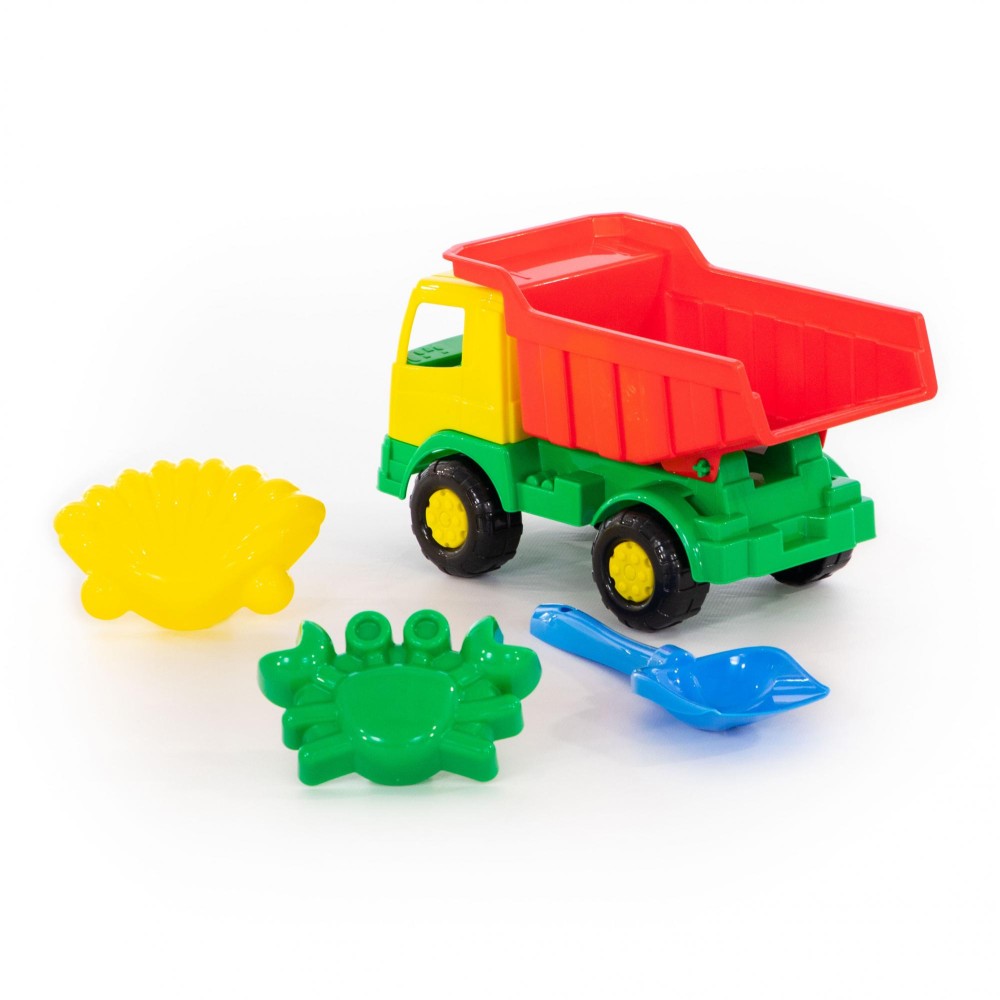Автомобиль-самосвал "Мираж" имеет оптимальный размер для игры как дома, так и на улице. В кузове карьерного типа удобно возить, насыпать и ссыпать песок. В комплекте с автомобилем идут: лопатка №5, формочки (краб №1 + ракушка №1).