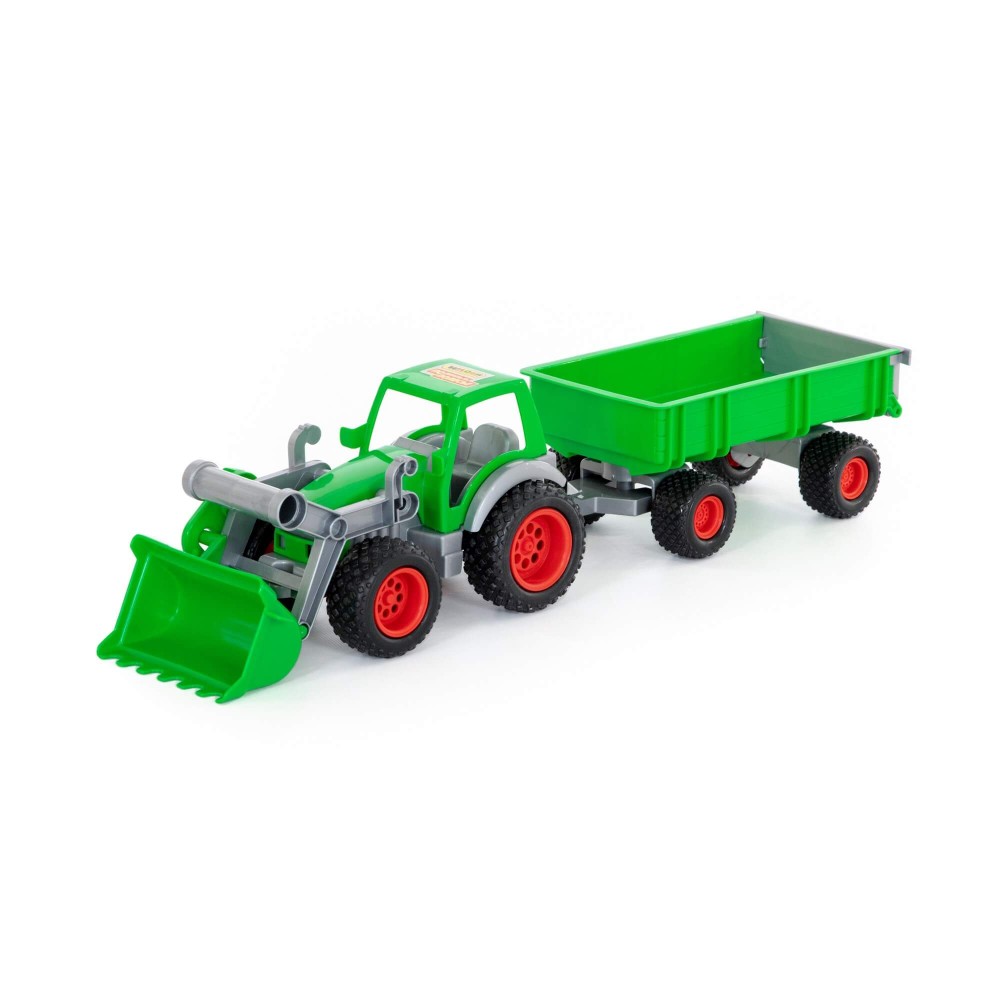 Трактор-погрузчик с прицепом из серии «Фермер-техник» - многофункциональная игрушка. Ковш трактора и борта прицепа подвижны, что добавляет реалистичности и удобства во время игры дома и на свежем воздухе. Прицеп можно отсоединить, что позволит использовать только кабину с ковшом. Колеса трактора имеют резиновые покрышки, которые повышают проходимость игрушки на любой поверхности. Игрушка продается в сеточке.