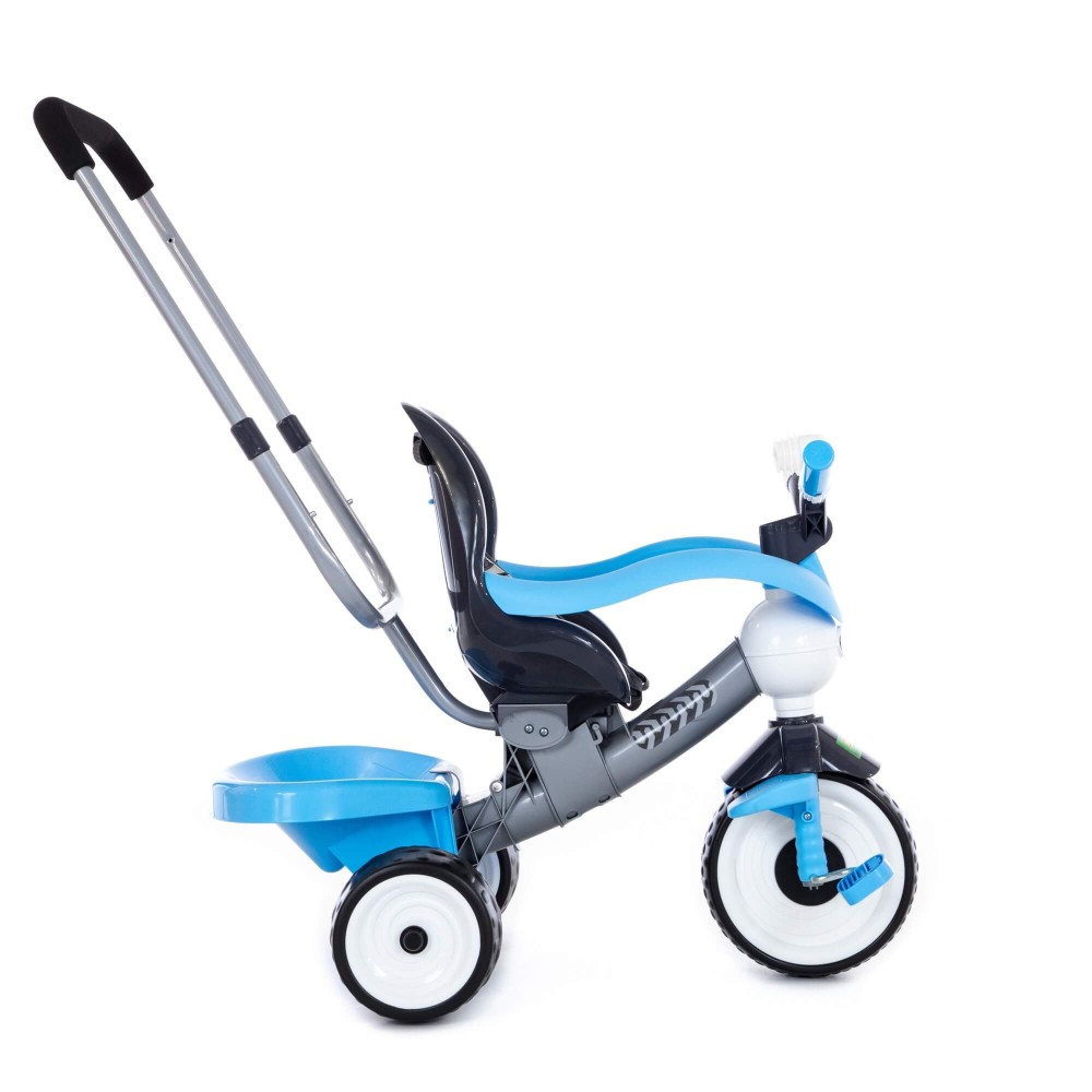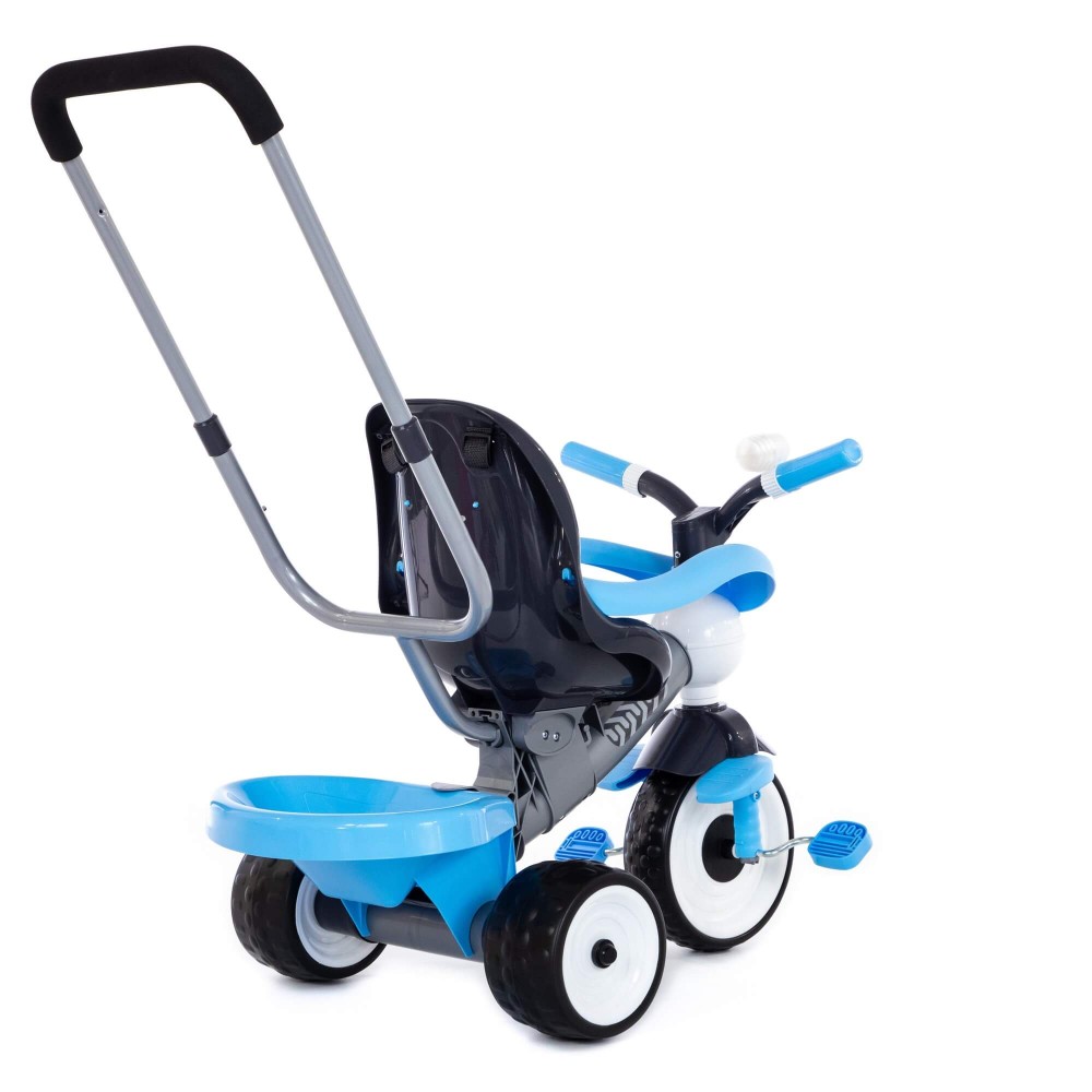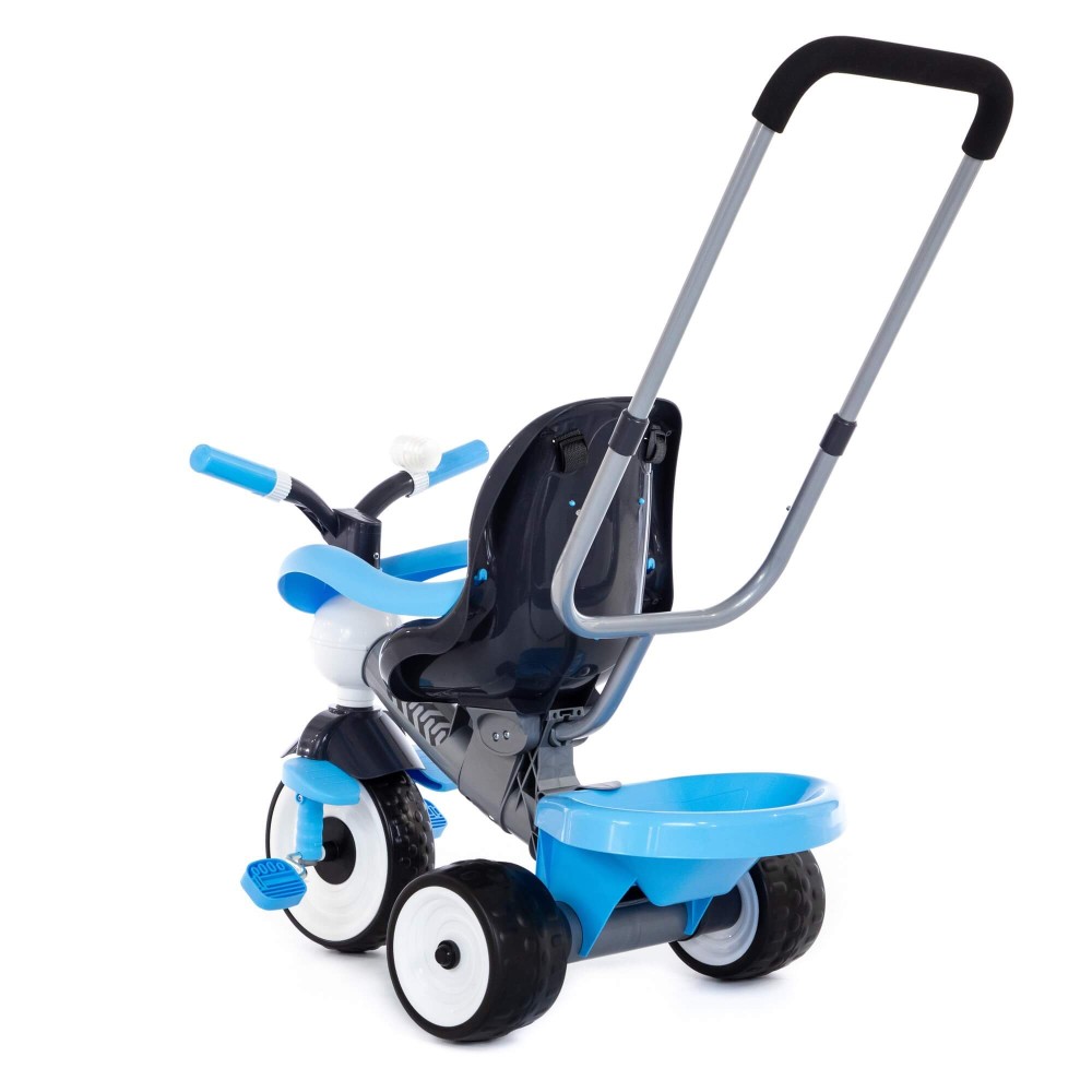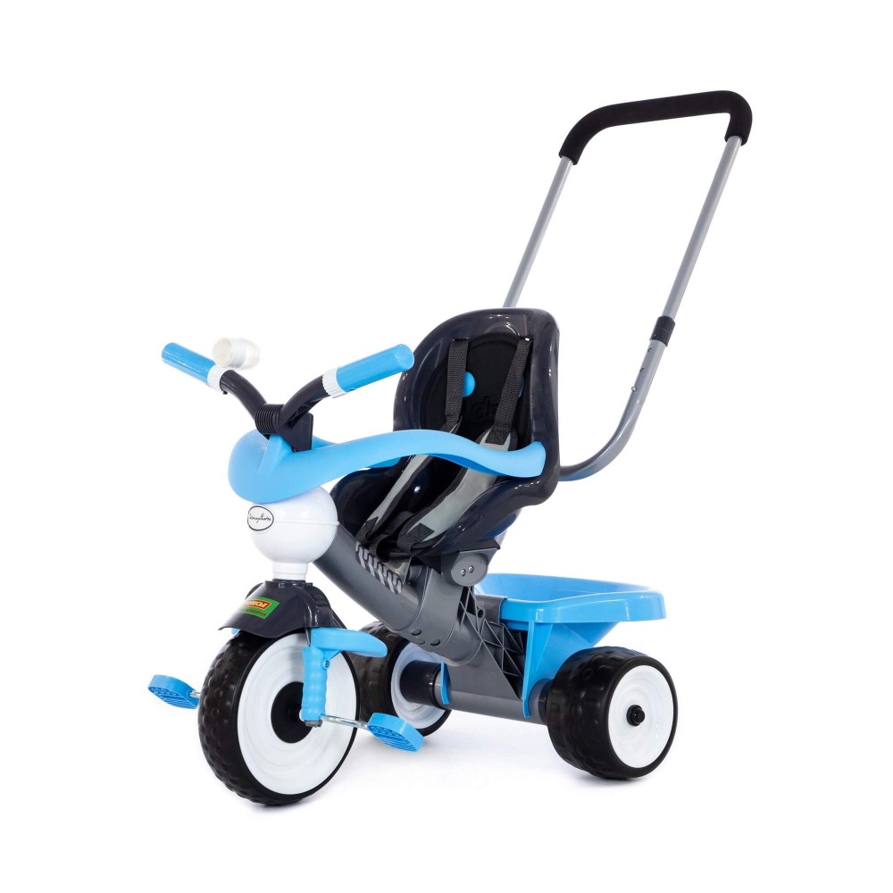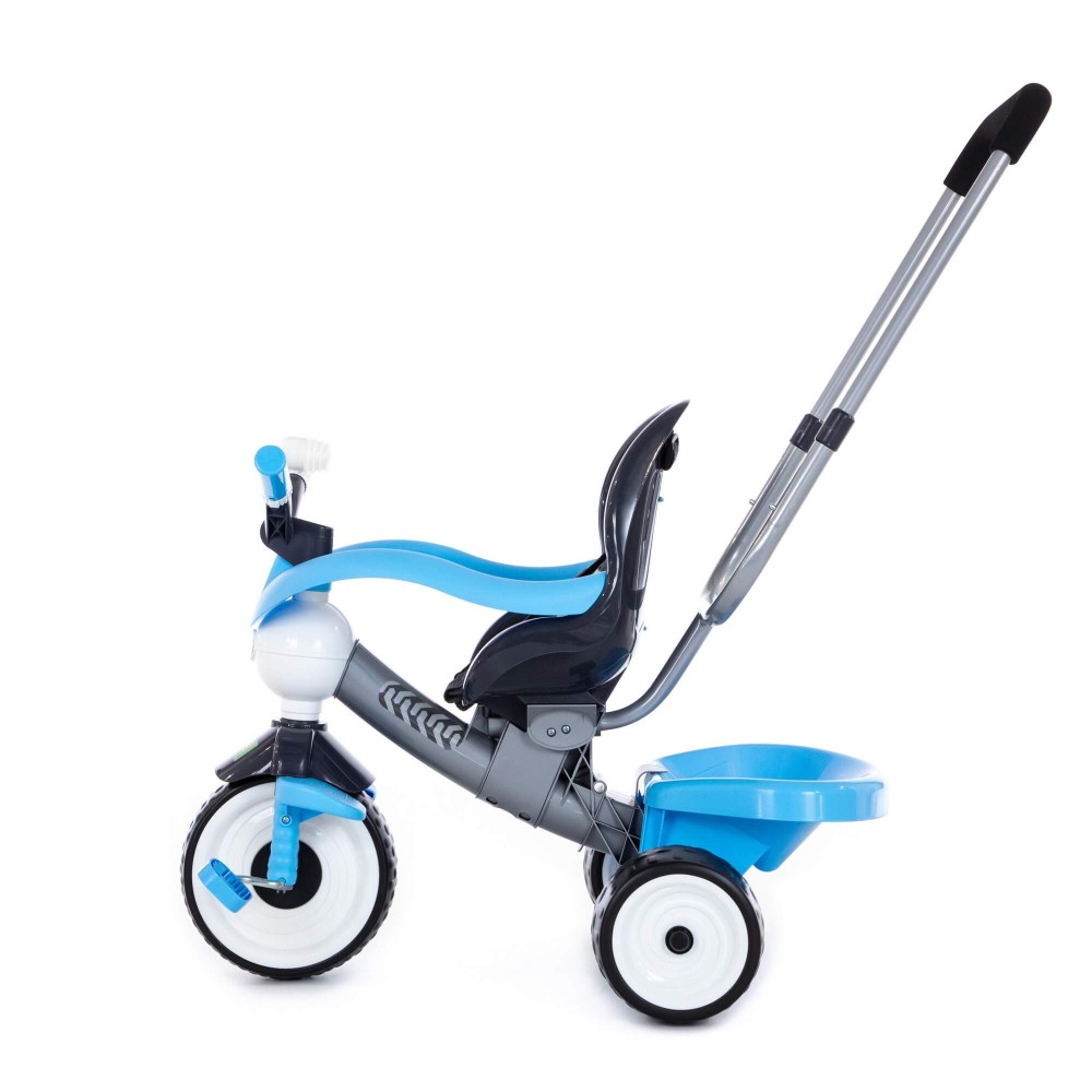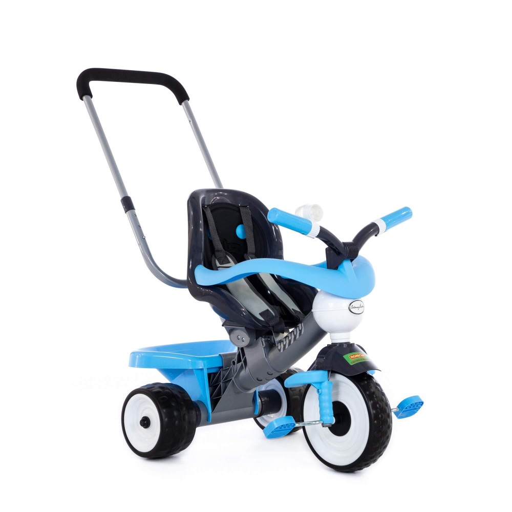 Данная модель трёхколёсного велосипеда серии «Амиго» оснащена ручкой управления, которая регулируется по высоте: нужно нажать на кнопку и зафиксировать ручку. Для удобства управления на ручке имеется мягкая накладка. Эргономичное сиденье велосипеда, ремни фиксации кресла, дополнительная подставка для ножек и съёмная дуга-ограничитель способствуют комфортному и безопасному перемещению ребёнка. На руле миниатюрного транспорта установлен клаксон, при нажатии на который раздаётся сигнал. Позади велосипеда располагается корзина, что позволяет брать необходимые вещи малыша с собой. С такой игрушкой прогулка на свежем воздухе превратится в увлекательное путешествие, а сам малыш научится ловкости. Езда на велосипеде также развивает координацию движений и укрепляет определённые группы мышц (особенно ног). В этой модели колёса выполнены из вспененного каучука (современного полимерного материала), что объясняет их лучшее сцепление.
