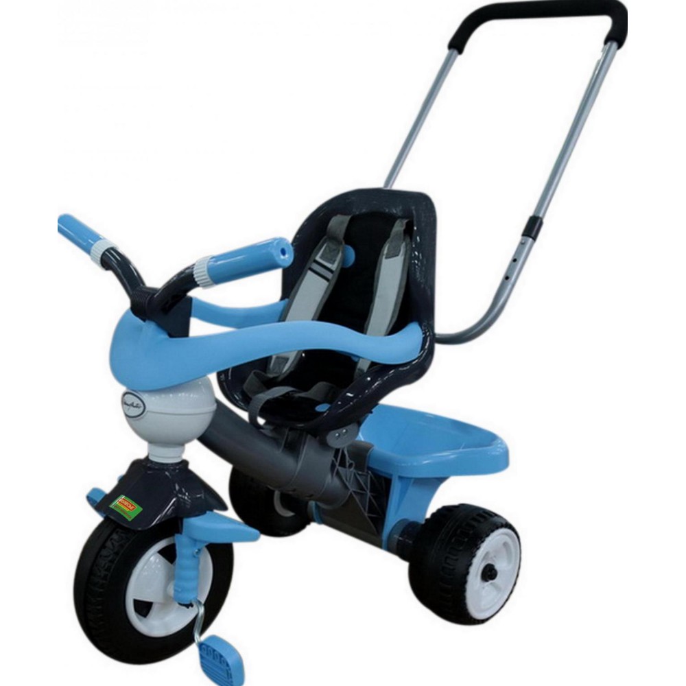 Данная модель трёхколёсного велосипеда серии «Амиго» оснащена ручкой управления, которая регулируется по высоте: нужно нажать на кнопку и зафиксировать ручку. Для удобства управления на ручке имеется мягкая накладка. Эргономичное сиденье велосипеда, ремни фиксации кресла, дополнительная подставка для ножек и съёмная дуга-ограничитель способствуют комфортному и безопасному перемещению ребёнка. Позади велосипеда располагается корзина, а в комплекте идёт прогулочная сумка, что позволяет брать необходимые вещи малыша с собой. С такой игрушкой прогулка на свежем воздухе превратится в увлекательное путешествие, а сам малыш научится ловкости. Езда на велосипеде также развивает координацию движений и укрепляет определённые группы мышц (особенно ног). В этой модели передние колёса пластмассовые, переднее - с резиновой вставкой, что объясняет лучшее сцепление колёс и более тихий ход транспорта.