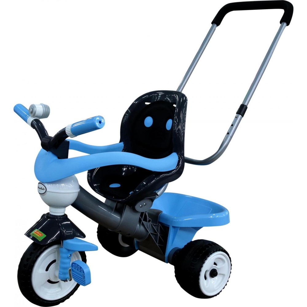 Эта модель трёхколёсного велосипеда серии «Амиго» оснащена ручкой управления, которая регулируется по высоте: нужно нажать на кнопку и зафиксировать ручку. Для удобства управления на ручке имеется мягкая накладка. Для безопасности и комфорта малыша дополнительно предусмотрены подставка для ножек и съёмная дуга-ограничитель. Позади велосипеда располагается корзина, что позволяет брать любимые игрушки на прогулку с собой. На руле велосипеда установлен клаксон, при нажатии которого звучит сигнал. С таким велосипедом малыш учится ловкости, развивает координацию движений, у него укрепляются определённые группы мышц (особенно ног). Колёса велосипеда пластмассовые.