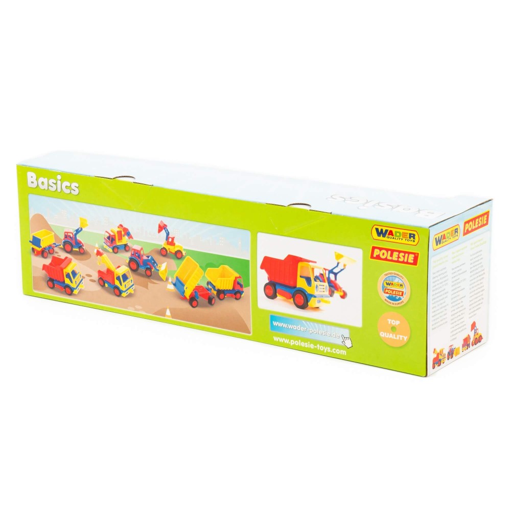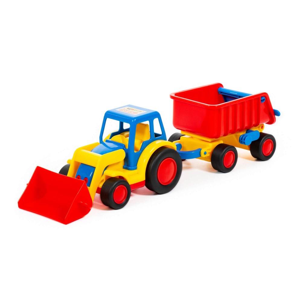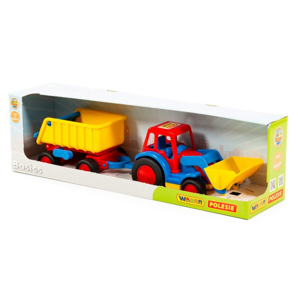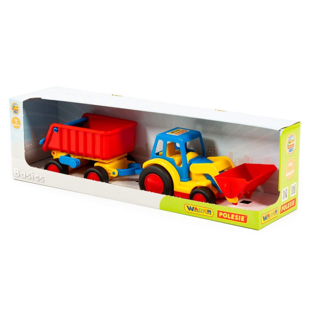 Стильные, удобные и небольшие машинки для малыша от фабрики «Полесье» — это серия «Базик». Они отличаются компактным размером, продуманной эргономикой, расцветкой и функционалом. Трактор-погрузчик имеет подвижный ковш. В дополнение предусмотрен прицеп, задний борт которого открывается. В прицеп можно загружать грузы и подымать кузов прицепа за специальную рукоятку. Колёса погрузчика и прицепа — с резиновыми накладками, что обеспечивает практически бесшумное катание игрушки на любой поверхности. А наличие буксировочной петли позволяет возить игрушку за собой на верёвочке.