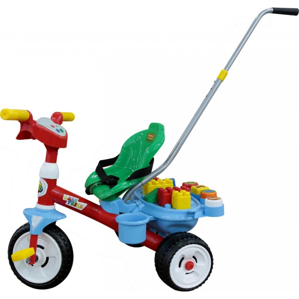 Яркий трёхколёсный велосипед серии «Беби Трайк» от фабрики «Полесье» имеет отличительную функцию «свободное колесо». Это позволяет крутиться колесу даже при остановке педалей; педали могут двигаться в обратную сторону и такое действие не будет мешать взрослым управлять велосипедом при помощи ручки. Данная модель оснащена музыкальной интерактивной панелью, которая не даст скучать малышу во время прогулки. Сиденье — с ремешком для фиксации малыша; за сиденьем велосипеда — ниша, в которой малыш сможет перевозить игрушки (в комплекте уже идут 11 элементов конструктора). Также имеется ниша для бутылочки с водой. Колёса велосипеда пластмассовые, конструкция надёжная.